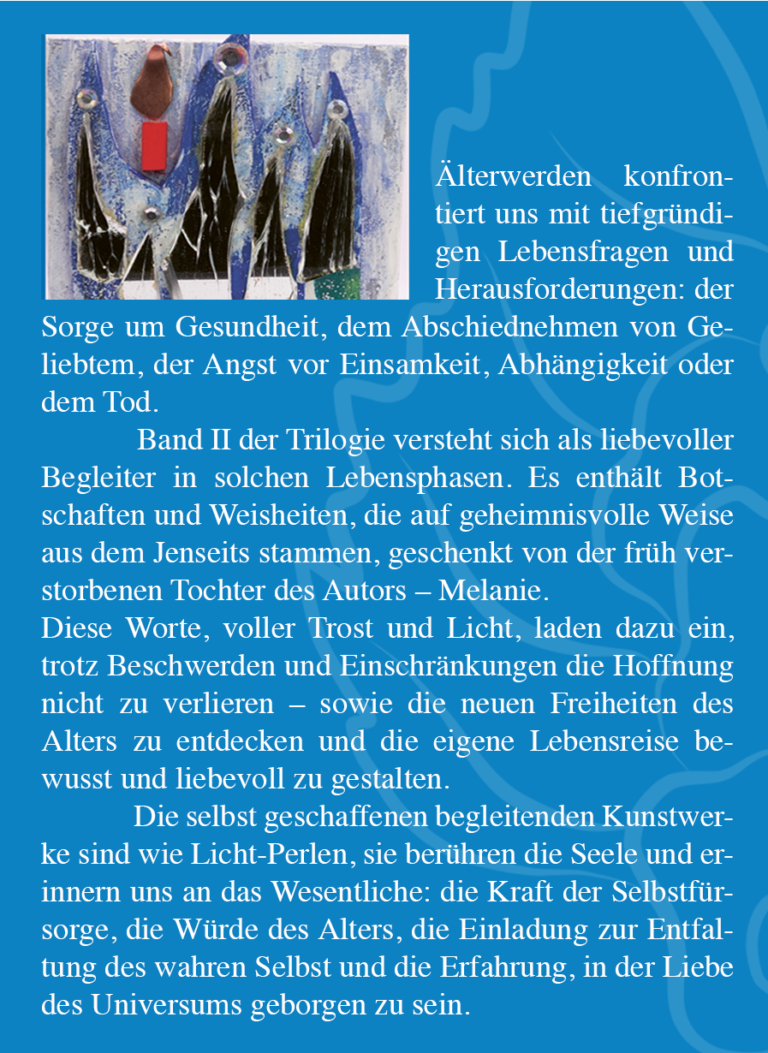 TROST-TROPFEN DER HOFFNUNG fürs Altwerden und Altsein; Band II, Seitenzahl 168, farbig 41, ISBN 978-3-69512-457-2, Preis Paperback Euro 15.99; E-Book Euro 6.99