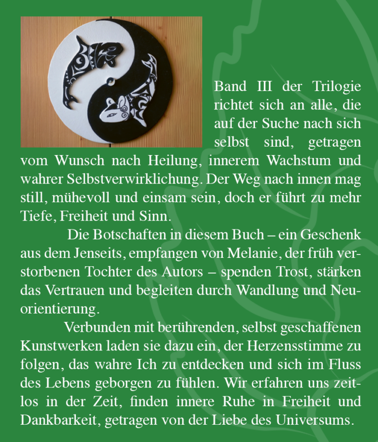 TROST-TROPFEN DER HOFFNUNG zur Selbstfindung und Heilung; Band III, Seitenzahl 184, farbig 45, ISBN 978-3-69512-468-8 , Preis Paperback Euro 15.99; E-Book Euro 6.99